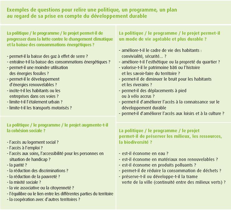 du 12 juillet 2010 portant engagement national pour l'environnement: L'objectif de développement durable répond, de façon concomitante et cohérente, à cinq finalités : « 1° La lutte contre le changement climatique ; « 2° La préservation de la biodiversité, des milieux et des ressources ; « 3° La cohésion sociale et la solidarité entre les territoires et les générations ; « 4° L'épanouissement de tous les êtres humains ; « 5° Une dynamique de développement suivant des modes de production et de consommation responsables. «